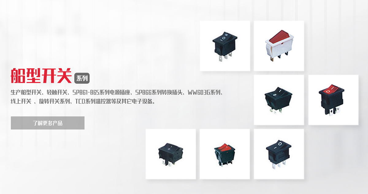 公司專業(yè)生產(chǎn)船型開關(guān)、輕觸開關(guān)、SP861-865系列電源插座、SP866系列轉(zhuǎn)換插頭、WW11系列微動(dòng)開關(guān)、WW01-03、09系列按鈕開關(guān)DS、WW系列指示燈開關(guān)、WW603G系列 線上開關(guān) 、旋轉(zhuǎn)開關(guān)系列、TCD系列溫控器等及其它電子設(shè)備。